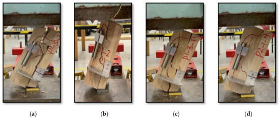 The typical failure modes observed for the specimens are illustrated in Figure 4. The specimens demonstrated rolling shear failure and had similar failure modes, as shown in Figure 4. Some of the samples failed abruptly at the end of the planar test. Some of the cracks initiated from the interface of the adjacent layer and then propagated along the growth ring in the cross-layer and continued along the entire cross-layer, causing bond line failure (Figure 4a,e). As can be seen, the cracks started from the wood fibre and then propagated through the cross-layer and developed to one side of the glue line. Some specimens exhibited the combination of rolling shear and rupture in the left-side lamella and developed to the glue line in the right lamella (Figure 4c). The results highlight that the dominant failure mode is rolling shear and a combination of shear and delamination. The failure modes of the four specimen configurations were quite similar. All results obtained from the planar tested specimens are summarised in Table A1.