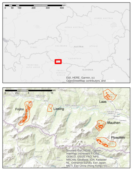 Location of the area under investigation in Austria, and locations of the blowdown areas in the five forest districts (Frohn, Liesing, Laas, Mauthen and Ploecken). Forest district borders are represented by the orange polygon lines, windthrow areas within the forest subdistricts are represented by orange-filled polygons.