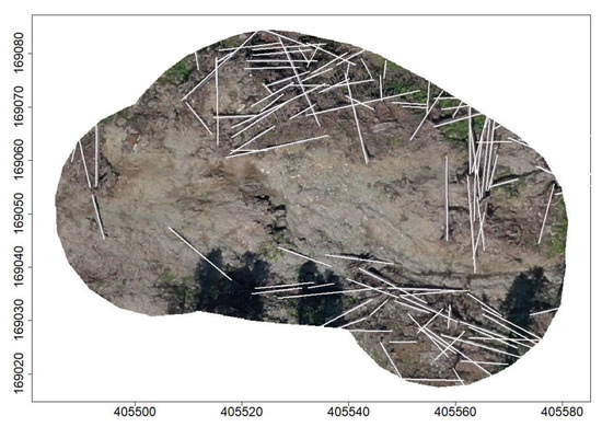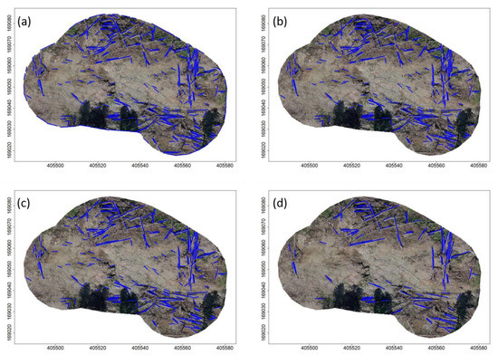 The initial line segment detection (Figure 7a) produced many artifacts at the border between the data and no-data cells; these were completely removed by the negative buffering (Figure 7b). The union of line segments (Figure 7c) became effective, especially in cases where stems were piled on top of each other. At this stage, there were still many false detections, mainly due to rock edges that could mostly be removed by Jenks’ natural break classification (Figure 7d). Finally, 114 stems were automatically detected, corresponding well with the manual reference of 113 stems.