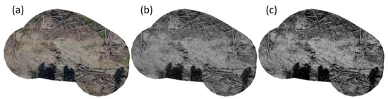 The different aerial RGB images were obtained under very different lighting conditions, and therefore, showed remarkable differences in white balance, exposure and contrast (Figure 2). Thus, the RGB images were converted to a greyscale image (Figure 6) via a linear approximation to the luminance (LUMA) using the function “grayscale” from the R package “imager” [41]. Then, the contrast of the greyscale images was optimized via piecewise affine histogram equalization using the function “EqualizePiecewise” from the R package “imagerExtra” [42]. Afterward, the exposure of the image was normalized to the 0–255 range (Figure 6), and the jpeg image was converted into the pgm (portable graymap) format using the R package “magick” [43]. The pgm file was then re-imported to R as an object of the class image matrix using the package “pixmap” [44].