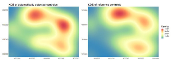 The KDE of the spatial distribution of stem centroids obtained using automatic detection and the reference was very similar (Figure 8). According to a Fasano–Franceschini test, there was no statistically significant difference (p = 0.70) between the spatial distribution of stem centroids obtained using automatic detection and the reference data.