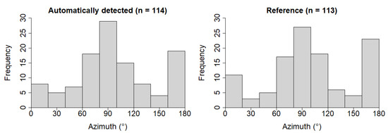 There was no statistically significant difference (p = 0.28) between the distribution of stem orientation (azimuth) obtained using automatic detection and reference data (Figure 9) according to a Kolmogorov–Smirnov test. The distribution of azimuths was bimodal, showing peaks at around 90° (west–east oriented) and at around 0°/180° (north–south oriented).