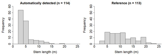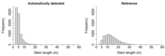 The distribution of the stem lengths obtained with the automatic procedure showed a statistically significant difference from the reference data (Kolmogorov–Smirnov test: p < 0.001), and a clear underestimation of the stem lengths became obvious (Figure 10).