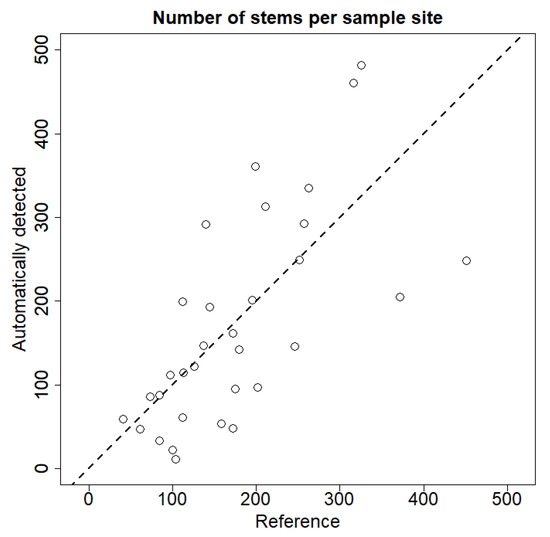 Correspondence of the number of automatically detected stems with the reference data on n = 38 sample sites. The dashed line is the 1:1 line.