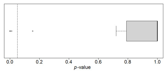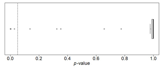 - Holm, S. A Simple Sequentially Rejective Multiple Test Procedure. Scand. J. Stat. 1979, 6, 65–70. [Google Scholar]