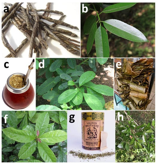 Holly beverages in China—(a) kudingcha and (b) one of its source plants Ilex latifolia; South America—yerba maté (c) and guayusa (e) and their source plants I. paraguariensis (d) and I. guayusa (f); and the United States—yaupon (g) and its source plant I. vomitoria (h). Photographs from Wikimedia Commons by Sjschen (a); Jorge Alfonso Hernández (c); Phyzome (d); Anna Premo (e,f) and Bryon White in the Yaupon Brothers American Tea Co. (g).