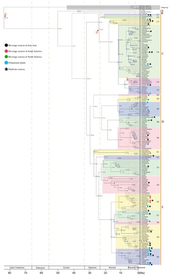 Ilex species with different uses mapped onto the phylogeny, based on Figure 1 in Yao et al. []. This figure is a chronogram of 177 Ilex species with three macrofossil constraints and three Helwingiaceae species as outgroups, estimated in BEAST2, A–E indicated the phylogenetic clades. Positions of the fossil constraints are indicated with red arrows and letters (A–C). Median ages are presented near nodes as million years (Ma). Nodes with posterior probability lower than 0.80 are labeled by empty blue circles. Black, red and green circles next to species name indicate that it is used as a beverage source in East Asia, South America or North America, respectively. Blue hexagons and black stars indicate species that are used as ornamental plants or medicine sources, respectively.