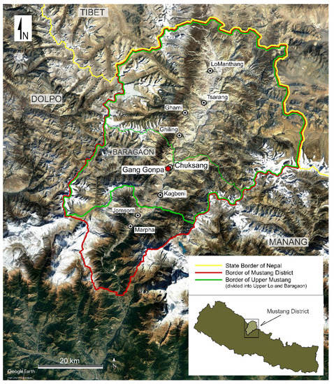 Upper Mustang is a restricted area situated in north-west Nepal, beyond the northern walls of the main Himalayan range, between the Annapurna and Dhaulagiri massifs, both rising above 8000 m a.s.l. Upper Mustang is a significant part of a large administrative district, Mustang, located in the Dhaulagiri Zone (Figure 1). Its territory extends along the river Kali Gandaki into the high Tibetan plateau, in the gorge that is one of the pathways through the natural barrier of the main Himalayan chain, acting as a link for trade and conquest, the spread of cultures and religions, and for migration and colonization [3]. The Salt Route running through Upper Mustang was the most ancient and regularly used passage through present-day Nepal [4,5,6].