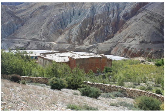 The term “gönpa” comes from Tibet and means a Buddhist temple inside or outside a monastery, which is also a center of study and a place of religious ceremonies. Gönpa Gang is located in the southern part of the restricted area of Upper Mustang. The region, Lower Lo, is more commonly referred to by its Nepali name of Baragaon, “Twelve Villages” [13]. It contains an enclave, Shöyul, where the pre-Tibetan language, Seke, is still spoken. The gönpa belongs to the five villages of the Shöyul: Taye, Tshug (Chuksang), Te, Tsele, and Gyaga [3]. The monument is situated on the west bank of the river Kali Gandaki (Figure 2). It is clearly visible from the village Chuksang.