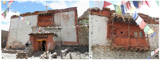Gönpa Gang is made from simple elements of Tibetan architecture, namely masonry walls, timber posts, and beams. The building is of imposing size. The plan of the gönpa fits into a rectangle, with approximate dimension of 20 m by 25 m. The main entrance to the building is on the eastern façade (Figure 3a). There are stone steps leading up to a small projecting masonry porch. Above the porch, there is projecting entablature supporting a balcony with a large rabsal window (closed with later masonry) and a two-tiered projecting canopy [1] (Figure 3b).