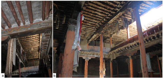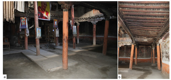 Gönpa Gang ground floor: (a) assembly hall (dukhang); (b) assembly hall—a bay between the firs and the second main beams spanning north–south.