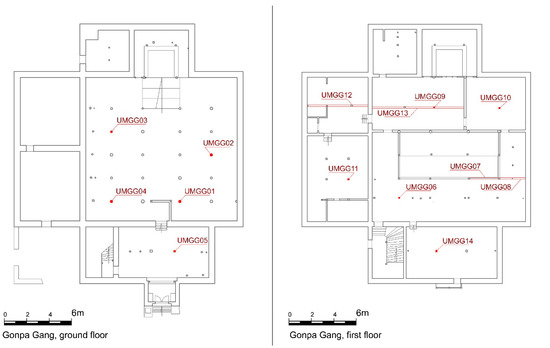 Plans of the ground floor and the first floor of the gönpa. The sampled elements are marked in red and labeled.