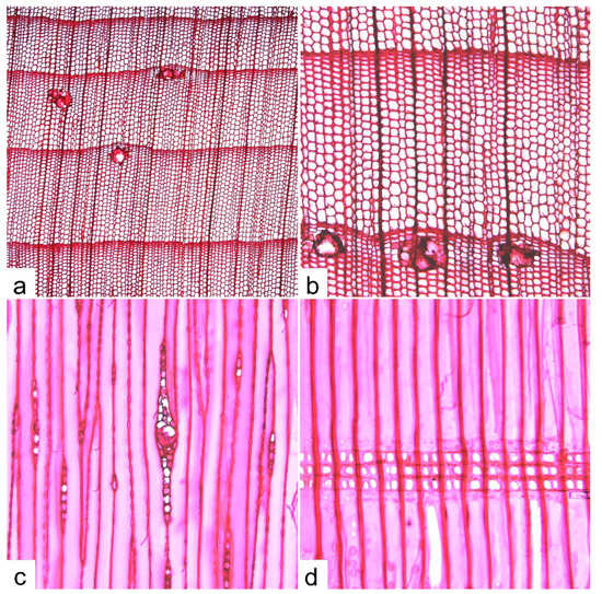 Himalayan pine—Pinus wallichiana A.B. Jacks—used as a timber in Gönpa Gang. Element no. UMGG10. Microscopic slides: (a) cross section in which the well-defined growth rings and the gradual transition from early to latewood is visible; (b) cross section—three resin canals located in the latewood are visible; (c) tangential section—uniseriate and fusiform rays are visible; (d) radial section—a heterogeneous ray with window-like pits in cross fields is visible.