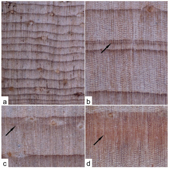 The intra-annual density fluctuation detected in a few samples (Table 2) mostly occurs within juvenile wood, formed during the first 20–30 years of the tree’s life [44,54] (Figure 9c,d). Moreover, one missing ring was detected in sample no. UMGG03, and one false ring (IADF) was found in sample no. UMGG09 (Figure 9b).