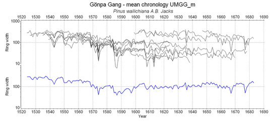 From the 14 samples collected in Gönpa Gang, 18 series were worked out. Since cores no. UMGG02, UMGG03, UMGG06, and UMGG13 contain a sufficient number of rings on both sides of the pith, two sequences were measured for each of them. Hence, 15 series from 12 samples were synchronized and used for the development of the mean chronology, UMGG_m, with a total length of 160 rings (Figure 10). The samples not included in the mean chronology are: sample no. UMGG05, containing 29 rings, which is not sufficient for reliable synchronization, and sample no. UMGG13, containing 68 rings.