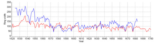 For the cross-dating of the newly developed chronology, UMGG_m, three different reference chronologies were used (Table 3). The first one is Southern Mustang master chronology (SM_Schmidt) by Schmidt et al. [30,31]. The level of agreement is very high both for the chronology UMGG_m (Table 3) and for single, dated series (Table 4). The dated chronology UMGG_m covers the period from 1524 to 1683 (Figure 11). The samples that could not be dated using SM_Schmidt reference chronology are UMGG01 and UMGG05. Sample UMGG01 was, however, synchronized with chronology UMGG_m, and the last ring was dated back to 1680. Sample UMGG05, which contains only 29 rings, could not be dated or synchronized using statistical evaluation. Attempts at visual cross-matching with chronology UMGG_m were made, and the possible position between 1623 and 1651 was found. Still, the series is too short to consider this result as reliable. Moreover, the series represents juvenile wood (between the 5th and 33rd year of the tree’s life), so the tree-ring pattern can be irregular and most likely reflects mainly tree-specific variation [44,54].