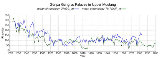Visual cross-matching of the chronology representing timber from Gönpa Gang: UMGG_m (blue curve) with the chronology developed from timber found in Tsarang Palace and Thinggar Palace in Upper Mustang [37] in green. Only the overlapping period of the two chronologies is presented here. (TSAP-Win [48]).