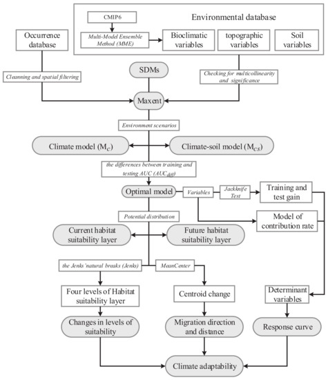 Species distribution models (SDMs) have become important tools to discover the effects of climate change on species during the last two decades [13,14]. SDMs can simulate the basic niche of species based on the dependence of species on environmental factors and obtain the habitat suitability of species [15]. An increasing number of scholars apply SDMs to the fields related to the relationship between species and climate change, such as assessment of biological invasion risks [16], conservation of endangered species [17], and the research of species’ vulnerability to climate change [18]. Maximum entropy model (Maxent) [19] has become one of the most commonly used SDMs for years, which has the advantages of less requirement of sample size and category, flexible variable processing, and excellent simulation effect [20,21]. Zhang et al. (2021) established Maxent and prioritizr models to simulate the potential distribution of 60 native species in the Yanhe River catchment [22]. Dyderski et al. (2018) predicted most of the species studied that would face a significant decrease in suitable habitat area under the assumptions of limited migration [9]. Lim et al. (2018) found that warm temperate evergreen forest shows distinctive northward migration and substantial increase, and subalpine forest areas and regions with high diversity decreased due to climate change [23].