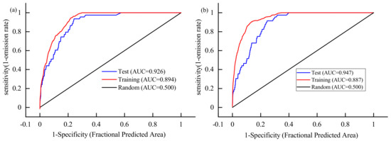 The receiver operating characteristic (ROC) curve of M and M: (a) indicates the ROC curves of M; (b) indicates the ROC curves of M.