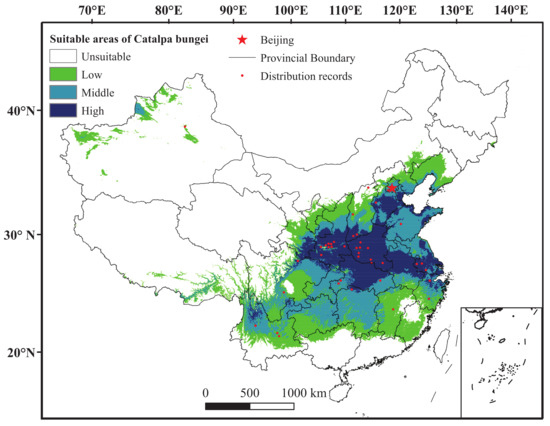The study indicated that the core areas of C. bungei are mainly distributed in Shandong Hills, Henan, Hubei, Shaanxi, Jiangsu, Hunan, and the section of the North China Plain in Hebei, which is basically consistent with the conclusions of previous studies [53]. There are eastern core areas close to continuous middle suitable areas, the southern part of widely distributed low suitable areas in the Yangtze River Basin, and northern suitable areas relatively small due to the low temperature generated by the high altitude.