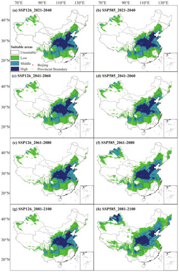 Under SSP126 and SSP585, the increase of mean temperature of coldest quarter drives the migration of C. bungei to the north and expands low suitable areas by more than 50%. The middle and high suitable area basically remains stable under SSP126, but increases by above 40% and 15%, respectively, under SSP585. The center of distribution has an obvious indigenous movement and will transfer from the junction of Shaanxi and Hubei to the north of Shaanxi. By the end of the 21st century, temperature and precipitation would increase, especially in high-altitude areas such as Western and Northern China, where they increase the fastest [36]. In that time, elevated temperature leads to prolonged growing seasons and increased vegetation activity in Northern China [62], which may be the reason for its expanding into northeast China and decrescent original habitats. The climate scenario of SSP585 has the greatest impact on its habitats such that most suitable areas degenerate in the south of the Yangtze River Basin, especially in Anhui, Hubei, and Jiangsu, but tend to strengthen in the Loess Plateau, Haihe Plain, and the north of the Yellow River Basin. Li et al. (2015) used the classical Holdridge life zone model to assess vegetation zone responses to climate change, which also suggests that future climate change will contribute to the growth and expansion of forest zones on the Loess Plateau [63]. The stable habitats are located in warm-temperature areas such as the south of Shaanxi and Hebei and the north of Hubei and Henan. In general, the results show the increase of overall suitable area and migration to high latitudes of middle and high suitable areas. Consistent with most studies, warming will result in migration of species to higher latitudes [64,65], and the rate of northward migration is positively associated with the degree of warming [66,67].