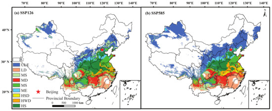 The growth subregions of C. bungei under SSP126 and SSP585. Panel (a) indicates the growth subregions under SSP126; panel (b) indicates the growth subregions under SSP585. U, ULE, LD, LS, MD, MS, ME, HSD, HWD, and HS represent unsuitable zone, unsuitable and low enhancement zone, low-stable zone, low-degenerate zone, middle-degenerate zone, middle-stable zone, middle-enhancement zone, high-strong degradation zone, high-weak degradation zone, and high-stable zone, respectively. The former of “-” indicates the grade of suitable areas under the current climate, while the latter indicates the average trend of the suitable areas in the next four periods. The degradation zone indicates the grade of current suitable area decline, while the enhancement zone indicates the grade rise. The weak degradation zone indicates the decline of 1 level, while the strong degradation zone grade drops by 2 or more; the stable zone indicates the unchanged level.