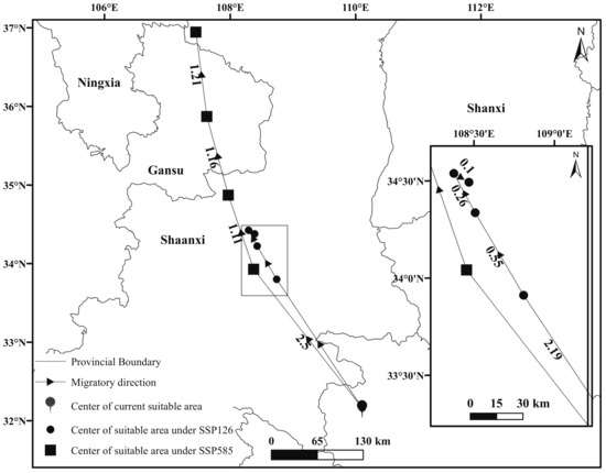 The center of the suitable areas for C. bungei is located at the location (32.3 N, 110.2 E) (Figure 6). Under SSP126, it will move 2.19 × 10 m and 0.55 × 10 m, respectively, in 2021–2040 and 2041–2060, with a tendency to fast migration to the northwestward but relatively and slowly after that. The total longitudinal and latitudinal offset of the migration was 1.77 and 2.25. Under SSP585, the characteristic of migration for C. bungei was significantly different from that of SSP126. With the distance of migration greater than 1 × 10 m in each period, the total longitudinal and latitudinal offset reaches approximately 2.7 and 4.76 by 2100, which leads to the relocation of the center to the north of Shaanxi province (37.05 N, 107.46 E). According to the change of migration rate, it decreases with time and reaches the minimum of 0.1 × 10 m in 2081–2100, and the migration direction shows a trend of migration to low latitudes under SSP126. Under SSP585, the migration rate increases slowly in the latter three periods, showing a trend of continuous movement to the northwest in the future.