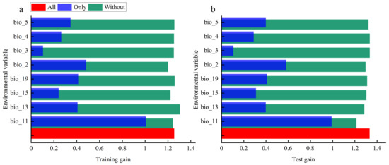 Jackknife tests the importance of the training and test sets of variables to distribution of C. bungei. Panel (a) indicates training gain of variables; panel (b) indicates test gain of variables.