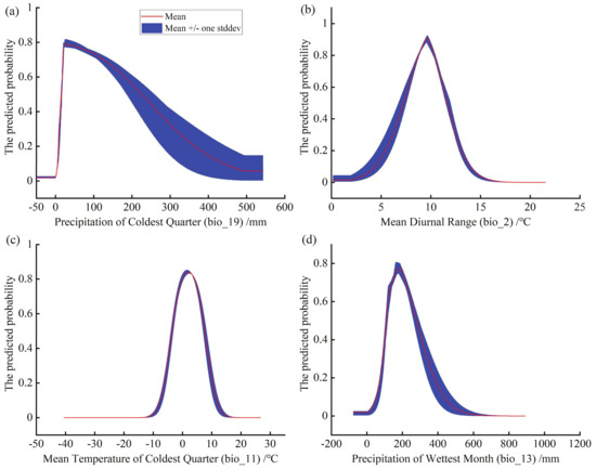 The response curve of the dominant environmental factors. Panel (a) indicates that of bio_19; (b) indicates that of bio_2; (c) indicates that of bio_11; (d) indicates that of bio_13.