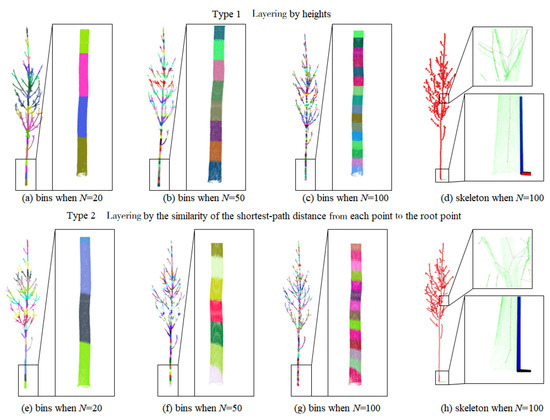 For this general procedure, the two classification rules and the number of bins are the key factors influencing the model output, as shown in Figure 1, where N represents the number of layers. When using the method of layering by heights, center deviation at the trunk bifurcation is huge, while using the method of layering by the similarity of the shortest-path distance from each point to the root point, the output is relatively better, however, there is still a large deviation near the root. To solve the problem, Wang [13] adopted the method of excavating a partial root to retain accessibility with the certain radius of bin. Each center of bin near the root can be very close to the center of the branch, which implies that the problem can be solved. Generally, the centroid of the bin is used as the center of the bin.