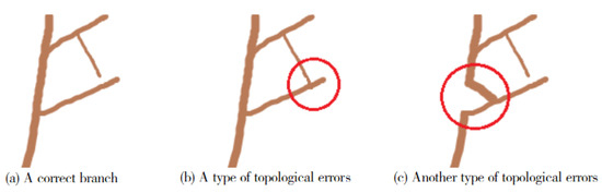 Topological correctness is also crucial and is a challenging problem [14]. Model topology using the skeleton can be simply thought of as the connection between the skeleton nodes, that is to say, skeleton lines [15]. Topological correctness means that the skeleton could correctly express the relationship of real offshoots [16]. In other words, skeleton lines that do not accord with the real trunk bifurcation should not be produced. There are two main conditions. One is that there is no error violating the natural law that two or more different parent offshoots cannot produce a same sub offshoot, as shown in Figure 2b. The minimum spanning tree (MST) algorithm (including Prim’s MST algorithm and the Kruskal algorithm) can be used to avoid this problem after the skeleton is produced [17,18]. However, it is difficult to ensure that the sub offshoot in the skeleton this time is connect to its true father offshoot. The other is that there is no error that part of one offshoot is connected with another offshoot, as shown in Figure 2c. Using the described general procedure, there will be incorrectly connected skeleton nodes: although it is easy to ensure skeleton nodes on the same layer cannot be connected with each other, topological errors between different levels can hardly be avoided.