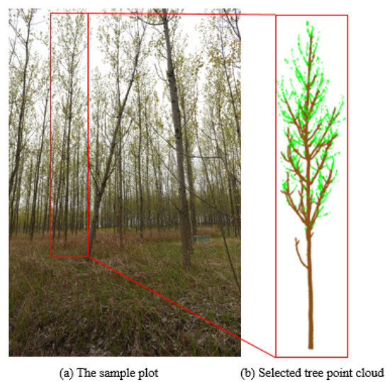 We used a tree point cloud scanned in Chenwei forest farm, Sihong County, Suqian City, Jiangsu Province, China. The tree species corresponding to the point cloud used in this research is American black poplar (Populus deltoides) which was planted in Spring, 2007, and scanned in Autumn, 2019. The tree point clouds were scanned by RIEGL VZ-400i TLS scanner with scanning mode Panorama40, as shown in Table 1. A tree point cloud was randomly selected. Figure 3 is the photo of the sample plot. This tree point cloud will mainly be used for the experiment. In Figure 3, the tree point cloud was already separated into a point cloud of the branch and a point cloud of leaves, which uses a kd-tree with radius m.