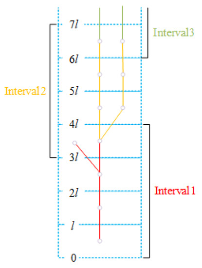 In order to improve the speed, the recursive problem is transformed into a non-recursive one. It can be seen in the ISTTWN algorithm that, before recursion, the clustering algorithm is executed to judge the number of clusters that the current branch point cloud has. The recursion depth of the ISTTWN algorithm can be divided into several intervals, each interval is composed of a part of the whole tree. At first, cluster and judge the number of “small trees”, and then make further recursion on each “small tree”, which can effectively reduce the time. Assuming that the interval length is not divisible by step length, the worst situation is that all calculated centroids deviate from centroids calculated by the ISTTWN algorithm, and the probability of this situation is very high. Therefore, in order to ensure that the interval length is divisible by step length, the number h of steps per interval is introduced, where and