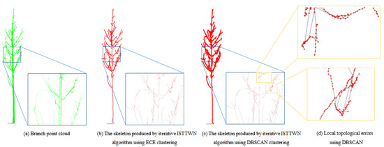 There are 187,706 points in the branch point cloud of the American black popular. The shortest-path distance from each point in the branch point cloud to the root point is calculated. The longest distance is 26.484700 m. Take the iterative ISTTWN algorithm as an example, as shown in Figure 7 where the input branch point cloud, the skeleton using ECE and the skeleton using DBSCAN are shown. The main parameters are set as .