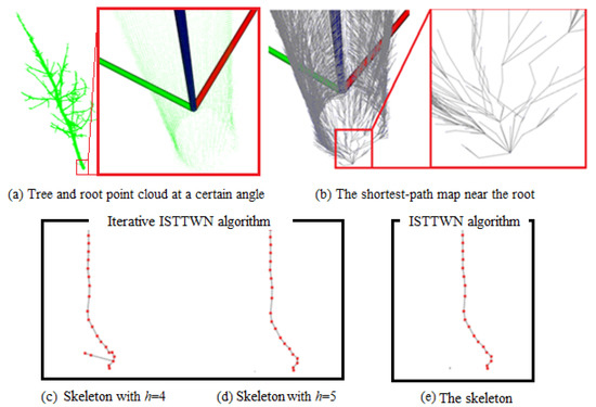 Before discussing, it is worth noting that the point cloud at the root is not processed in this research, and the shortest-path map from each point near the root to the root point presents a radial shape. The size of h determines how much the point cloud covers the original point cloud in each interval after segmentation, but it also affects the speed of time. Increasing the step length l is an effective scheme, but in order to make the skeleton fine enough, it is necessary to adjust h when the step length is small. The smaller the h is set, the faster the speed is. However, due to the small number of points in the subset of the point cloud, it is easy to cause different local clustering results. This is very obvious near the root of the branch point cloud. In the ideal state, the speed is the fastest when . However, if h is set too small, unreasonable branches will appear at the root, which will cause trouble for subsequent processing. A convenient way to determine the appropriate value of h is to see whether there are branches at the root of the skeleton established by the point cloud without root pretreatment. For the branch point cloud used in this experiment, the minimum h is set to 5 and as shown in Figure 8, the root skeleton is consistent with the ISTTWN algorithm.
