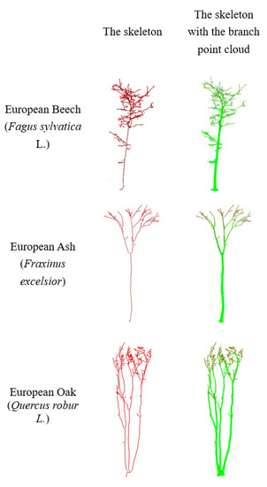 We also randomly used the tree point clouds of three public tree species provided by Seidel et al. [32] including European beech (Fagus sylvatica L.), European ash (Fraxinus excelsior) and European Oak (Quercus robur L.). Similarly, these clouds have performed the separation of branches and leaves, as shown in Figure 4. Each radius was set as 10x average point cloud intervals. These will mainly be used to verify the universality of the proposed algorithm. The tree ages are beyond 40, beyond 40 and beyond 70.