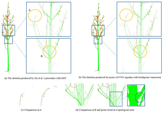 For easy understanding and description, the skeleton created with Xu et al.’s procedure is called the Xu skeleton and the one created with our method is called the ISTTWN skeleton. As shown in Figure 10c, there are more small offshoots in the ISTTWN skeleton. In other words, the Xu skeleton failed to express some existing offshoots. The Xu skeleton has a bigger center deviation at trunk bifurcation compared with the ISTTWN skeleton. The Xu skeleton showed some incorrect offshoots relationship which is caused by the algorithm itself as the wrong skeleton does not pass through the point cloud. Although the ISTTWN skeleton has similar problems, they can be effectively alleviated by increasing h or l. Apart from in Figure 10d, when such a high-precision skeleton is not required, topological errors such as the sub offshoot connecting to the wrong father offshoots still frequently occur in Xu skeletons, as shown in Figure 11.