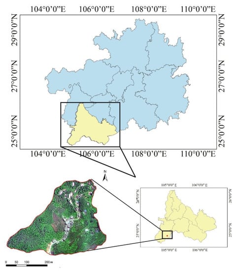 The study site is located in Nanpanjiang Town, Xingyi City, Guizhou Province in China, near the central area of the junction of Guangxi, Yunnan, and Guizhou provinces (113°12′40″ E, 24°52′10″ N). The terrain is high in the northwest and low in the southeast, with a slope of 30°~40° and typical karst geomorphic features. The elevation is 700~1300 m, meaning that it belongs to a zone of low latitude and high elevation, with a subtropical monsoon climate. The annual average temperature is approximately 20.25 °C, and the frost-free period is ~300 days. The annual precipitation is 1000~1500 mm, and the received average solar radiation is about 3.77 × 109 J·m−2 every year. The location of the study area is shown in Figure 1. The soil in the study area was limestone soil with a high rock exposure ratio.