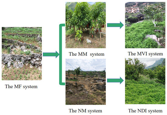 In the mango (Mangifera indica) monoculture system (MM), fruit trees were planted directly on sloping land. Mango seedlings were planted at a density of 670~820 tree ha−1 and did not fruit until 4 years after planting. They bloom from February to April each year, and fruits are subsequently harvested from July to August.