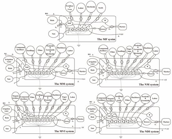 After the concept of emergy was first proposed by Odum [36], Ulgiati [37] and Campbell et al. [38] continued to refine the calculation process of the emergy method. The first step was to define the boundary of the systems. The boundary and emergy flow diagrams of the five planting systems are shown in Figure 3. A scientific and reasonable system boundary is beneficial to achieve an objective and accurate evaluation of the ecosystem.