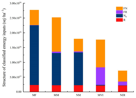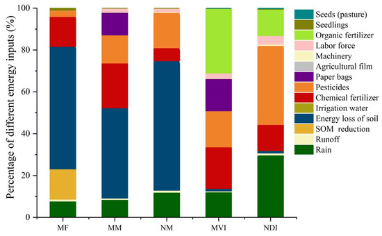 The total emergy input of five systems revealed that the MF had the highest emergy input density, followed by the monoculture orchards (MM and NM), leaving the intercropping orchards (MVI and NDI) with the lowest emergy input density (Table 6 and Figure 5). Compared to the MF, the total emergy input of monoculture orchards (MM and NM) decreased by 9.03% and 35.38%, and intercropping orchards (MVI and NDI) decreased by 36.46% and 74.12%.