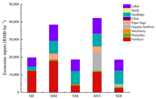 Mango orchards had the highest TC, whereas the MF had the lowest TC (Table 7). The details of economic inputs of the five systems are shown in Figure 6, wherein chemical fertilizer and human labor costs were the major economic inputs. The cost of chemical fertilizer in the MF accounted for 62.16% of the TC. The chemical fertilizer cost of the MF was 68.22% higher than that of NM, and 46.21% lower than that of MM. Similarly, the chemical fertilizer costs of the MF were 4.96% and 79.34% higher than those of MVI and NDI systems, respectively. In addition, the organic fertilizer cost of MVI and NDI modes accounted for 8.78% and 56.11% of the TC. The other economic costs of the monoculture and intercropping orchards were both higher than those of the MF, such as pesticides, seeds (fruit tree seedlings and legume herb seeds), and human labor costs. The machinery and agricultural film costs of the monoculture and intercropping orchards accounted for 0.29%~1.77% of the TC. Only the mango orchards (MM and MVI) had the costs for paper bags, which accounted for 7.72% and 8.56% of the TC, respectively.