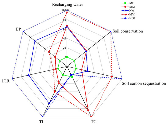 Based on the emergy method, the conversion of MF to orchard systems increased groundwater recharge, soil conservation, and carbon sequestration (Table 7). Compared to the MF, the groundwater recharge of orchard monoculture systems (MM and NM) increased by 3.55 × 1015 sej and 3.50 × 1015 sej, which were 1.94 and 1.92 times those of the MF. Meanwhile, the groundwater recharge of intercropping systems (MVI and NDI) increased by 4.30 × 1015 sej and 4.42 × 1015 sej, which were 2.36 and 2.42 times those of the MF. For soil conservation, the conversion to monoculture orchards (MM and NM) showed increases of 5.55 × 1015 sej and 5.13 × 1015 sej and the conversion to intercropping systems (MVI and NDI) showed increases of 1.60 × 1016 sej and 1.62 × 1016 sej. For carbon sequestration, conversion to monoculture and intercropping orchards showed increases of 1.51 × 1011~1.28 × 1012 sej.