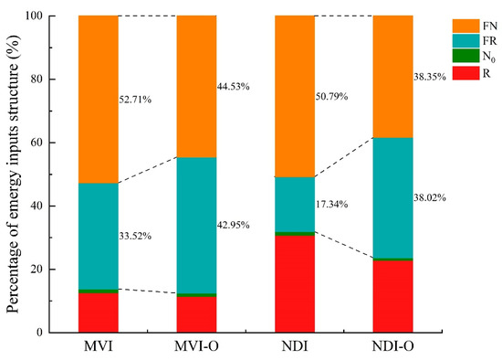 The integrated pest management systems (MVI-O and NDI-O) increased the purchased flow (FR + FN) and changed the proportion of FR and FN in the total emergy input (Table S2 and Figure 8). Compared to the intercropping orchards (MVI and NDI), the FR in the integrated pest management (MVI-O and NDI-O) systems increased by 10.40% and 21.11%, while FN decreased by 9.15% and 12.79% (Figure 8). In addition, the structure of purchased emergy inputs changes in MVI-O and NDI-O induced an increase in R% and EIR (Table 8). The R% of the MVI-O and NDI-O were 17.61% and 26.19% higher than those of the MVI and NDI, respectively. The EIRs of the MVI-O and NDI-O were 11.61% and 51.43% higher than those of the MVI and NDI, respectively. Nonetheless, the EYR in MVI-O and NDI-O systems decreased by 10.23% and 33.78%, suggesting that the implementation of integrated pest management decreased the product competitiveness in market. Compared to MVI and NDI, the ELR of MVI-O and NDI-O decreased by 27.87% and 40.19%, resulting in less pressure on the environment. Meanwhile, the ESI of MVI-O and NDI-O, with a slight increase, revealed that this improvement in the management approach enhanced the environmental sustainability. The EISD of MVI-O increased by 13.27%, indicating that the sustainable development ability of the MVI-O system was superior to MVI. However, it was worth noting that the EISD of NDI-O decreased by 17.98%, which means that the sustainability of NDI-O was not better than that of NDI.