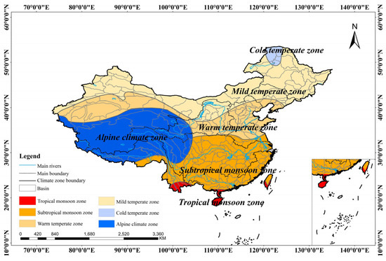 The distribution of 214 third-order watersheds across six climate zones in China.
