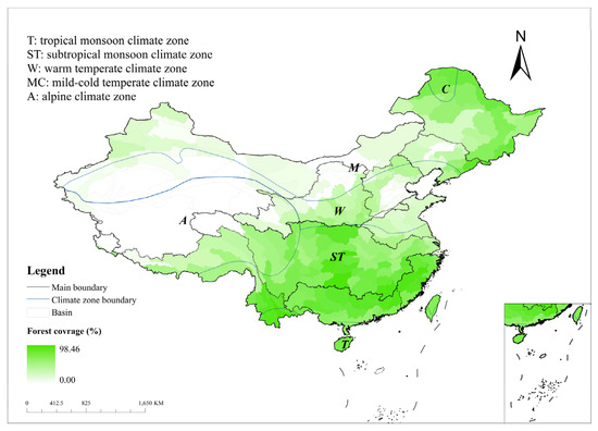 China (3°51′ N–53°33′ N, 73°33′ E–135°05′ E) has complex river networks, which can be classified into 214 third-order watersheds with areas ranging from 24.89 to 7.92 × 105 km2 according to the watershed classification criteria provided by the Institute of Geographical Sciences and Natural Resources Research, Chinese Academy of Sciences (CAS). Detailed information about the watershed size and climate conditions for 214 watersheds is listed in Table A1. There are six climate zones in China, including tropical monsoon (T), subtropical monsoon (ST), warm temperate (W), mild temperate (M), cold temperate (C), and alpine climate (A) zones (Figure 1). Given that only four watersheds are located in the cold temperate zone, we combined the mild and cold temperate zones into the ‘mild-cold temperate zone (MC)’ in the analysis. China is characterized by distinct spatial patterns of temperature and precipitation where annual precipitation and mean temperature increase from the north (e.g., 238.17 mm and −11 °C in the Chip Chap River watershed) to the south (e.g., 2000.36 mm and 23 °C in Hainan Island) (Table A1 and Figure A1). China also covers a wide variety of vegetation types including shrubs, grasses, broadleaf forests, coniferous forests, and tropical forests (Figure A2). Watersheds in tropical and subtropical climate zones are mainly dominated by forests while those in warm temperate, mild-cold temperate, and alpine climate zones are mostly covered by grass (Figure 2 and Table 1). The average forest coverage for watersheds in tropical, subtropical, warm temperate, mild-cold temperate, and alpine climate zones are 73.31, 60.88, 10.77, 26.13, and 1.36%, respectively. Human disturbances (e.g., industry, agriculture, hydropower development, and urbanization) are widespread across China, especially in southern, central, and eastern China. Water shortage is a common problem in most cities with low water resource capacity for economic development in northern China, which rely on the South-to-North Water Diversion Project to sustain water use by growing populations [41].