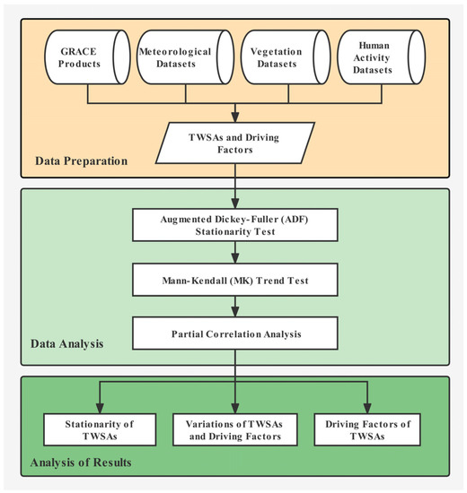 The augmented unit root test (ADF test) proposed by Dickey and Fuller was then used to test the stationarity of each time series of data, which can indicate the inter-annual variations of TWS [60,61]. In the ADF test, the stationarity is evaluated based on the absolute value of the characteristic roots [60,62]. If the t statistic is less than that of a given percentage level (e.g., 10% level) and the probability is greater than 0.10, the time series is non-stationary [63]. The non-parametric Mann–Kendall (MK) trend test was applied to detect the statistical significance of trends in data series, e.g., TWSAs for each study watershed from 2004 to 2014 with a significance level of 0.05 [64,65,66]. The partial correlation analysis was finally adopted in this study to detect the correlations between TWSAs and driving factors at a statistically significant 0.05 level, which can indicate the key factors for TWS variations, as well as the associated driving mechanisms [51].