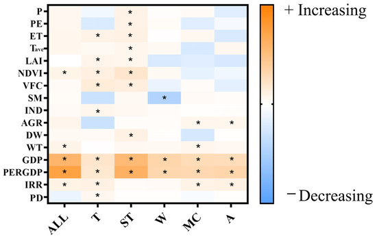 Figure 4 exhibits the results of trend tests for driving factors from 2004 to 2014. Significant increasing trends are detected in NDVI, GDP, PERGDP, WT, and IRR (p < 0.05) for all watersheds. Specifically, ET, LAI, NDVI, VFC, IND, GDP, PERGDP, IRR, and PD significantly increase in tropical watersheds. For subtropical watersheds, there are significant increments in ten driving factors (i.e., P, PE, ET, Tave, LAI, NDVI, VFC, DW, GDP, and PERGDP). Significant increments are found in the AGR, WT, GDP, PERGDP, and IRR in watersheds in the mild-cold temperate climate zone. Similarly, significant upward trends are detected in AGR, GDP, PERGDP, and IRR in watersheds in the alpine climate zone. Additionally, a significant decreasing trend is observed in soil moisture (SM), while significant increasing trends are tested in GDP and PERGDP in the warm temperate watersheds.