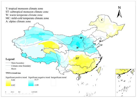 Note: T, ST, W, MC, and A denote tropical monsoon, subtropical monsoon, warm temperate, mild-cold temperate, and alpine climate zones, respectively. The positive values of MK tau denote increases in TWSAs, while negative values mean decreases. * Indicates significant at α = 0.05.