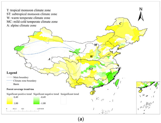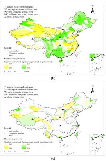(a) Forest coverage trends from 2004 to 2014 in 214 watersheds in China (p < 0.05); (b) grassland coverage trends from 2004 to 2014 in 214 watersheds in China (p < 0.05); (c) shrub coverage trends from 2004 to 2014 in 214 watersheds in China (p < 0.05).